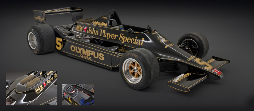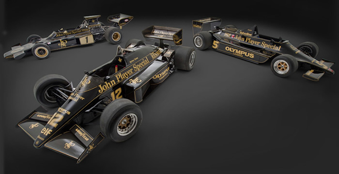 JPSロータスたち。左から、エマーソン・フィッティバルディのロータス72、アイルトン・セナのロータス94T、そしてValvolineのデカールが貼られたロニー・ピーターソンのロータス79。 |