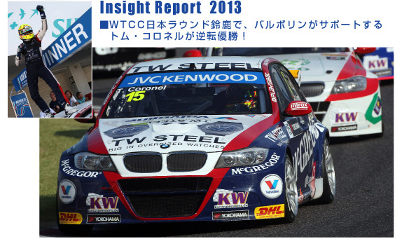 ![]() 毎回、熾烈なバトルを展開するWTCC(世界ツーリングカー選手権)も終盤。第10戦となるラウンド19&20は9月21~22日、快晴の鈴鹿サーキット東コース、2.243km×26周で行われた。ラウンド20となるレース2はWTCCにとって記念の200回目。それを制したのはバルボリンがサポートするトム・コロネル/BMW320TCだった。 「日本で勝ちたかった」と語るトム・コロネル。1999年のフォーミュラニッポンでのチャンピオンをはじめGTやF3など日本でのレース経験が豊富なだけに、日本は言わば第二の故郷。その鈴鹿を知り尽くしているコロネルは当初からレース2に焦点を絞っていた。まず予選で9番手の好ポジションを手にする。ローリングスタートとなるレース1では手堅く走りマシンのダメージもなく8位に着ける。ここまではコロネルと彼のチーム、ROALモータースポーツにとって完璧なレース運び。すべてはリバースグリッドとなるレース2に賭けていた。そして迎えたレース2では2番手グリッドとフロントローに着ける。ポールポジションは同じBMW320TCを駆るメルディ・ベナーニ。共にFRゆえスタートダッシュを得意とする。オープニングラップの第一コーナーではベナーニに先行を許す。が、コロネルは冷静だった。プッシュしながらも前を行くベナーニのタイヤのグリップ力が低下しつつあることを見て取る。そしてチャンスが訪れる。17周目の第一コーナー、一気にベナーニのインを差しトップに躍り出る。そこからは誰にも邪魔されることなくトップを快走し、後続のベナーニに2.2秒もの大差をつけ余裕でチェッカーを受けたのだった。コロネルにとってWTCC今季2勝目、験のいい日本ラウンドでは3勝目となった。 日本ラウンド終了時でのコロネルのポイントは143となり8位に着ける。残るは11月の中国・上海とマカオ。日本でもおなじみのオランダ人ベテランドライバー、トム・コロネルの活躍に期待したい。