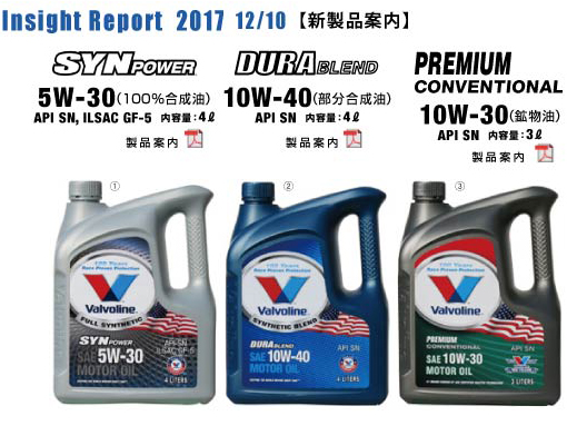 ①バルボリン「シンパワー5w-30」は、超高性能プレミアム100%合成基油と最先端のバルボリン添加剤テクノロジーを結集して開発した超高性能100%合成エンジンオイルです。完璧なまでのエンジン保護性能と流動性を発揮します。また、過酷な条件の下で使用される自然吸気、ターボまたはスーパーチャージャー付きの乗用エンジンに最適です。 ②バルボリン「デュラブレンド10w-40」は、ベースオイルに高性能合成基油とプレミアム鉱物油をバルボリンが誇る絶妙なバランスで配合し、そこにバルボリンの最先端テクノロジーで開発した添加剤システムを採用した超高性能部分合成エンジンオイルです。エンジン本来の持つ性能を最大限に発揮させ、エンジン保護性能に優れフリクションロスやパワーの低下を抑えます。また、デポジットを最小限に抑制して、エンジンをクリーンに保ちます。 ③バルボリン「プレミアムコンベンショナル10w-30」は、高品質プレミアムベースオイルとバルボリン独自の最新添加剤テクノロジーにより、API規格最新のSNに適合した高性能モーターオイルです。油膜保持性、熱安定性に優れ、過酷な運転状況下でもエンジンを保護します。ユニークな清浄分散添加剤により、デポジットを最小限に抑制して、エンジンをクリーンに保ちます。(新パッケージに刷新されました) |