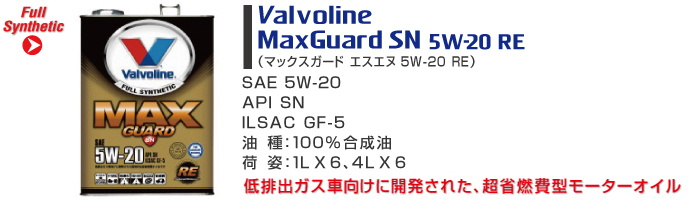 バルボリン マックスガード RE 5W-20 は、特に低排出ガス車向けに開発された超省燃費型の高性能オイルです。ベースオイルに100% 合成油を採用し、フリクションロスを低減させ強靭な油膜特性を発揮します。5W-20の粘度推奨車に最適なオイルです。