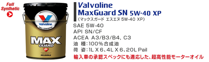バルボリン マックスガードSN 5W - 40 XPは、厳選した100%合成油と独自の添加剤を配合することで、究極の耐久性を誇り低回転から高回転域まで常に安定した油膜特性を保持し、エンジンを熱や酸化から守ります。API最新規格SNに合致し、さらにヨーロッパオイル規格ACEAにも余裕を持って合格しています。また、各輸入車の承認スペックにも適応しています。ミニバン、ラグジュアリーセダン、SUVに最適なオイルです。