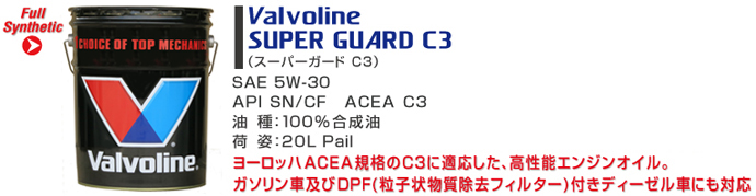 バルボリンスーパーガード C3 5W -30 は、最先端のエンジンオイル技術要求に適応するために100 % 合成基油と最新のテクノロジーにより厳選された添加剤を使用し、卓越した技術でブレンドした高性能エンジンオイルです。ヨーロッパACEA規格のC3に適応し、ガソリン車及びDPF( 粒子状物質除去フィルター)付きディーゼル車に対応しています。優れた熱安定性・酸化安定性により、オイル劣化を防ぎ、オイル交換周期の延長を可能にします。
