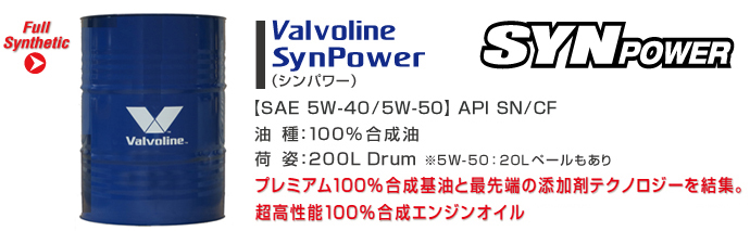 バルボリン シンパワー モーターオイルは、超高性能プレミアム100%合成基油と最先端のバルボリン添加剤テクノロジーを結集して開発した超高性能100% 合成エンジンオイルです。完璧なまでのエンジン保護性能と流動性を発揮します。また、過酷な条件の下で使用される自然吸気、ターボまたはスーパーチャー ジャー付きの乗用エンジンに最適です。