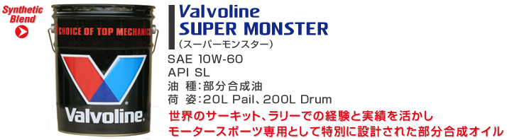 バルボリン・スーパーモンスターは、世界のサーキット、ラリーでの経験と実績を活かし、モータースポーツ専用として特別に設計された部分合成オイルです。超ワイドレンジの粘度設定により、低温時、高温時においても最適な粘度と流動性を発揮し、常にエンジンの性能をフルに引き出します。